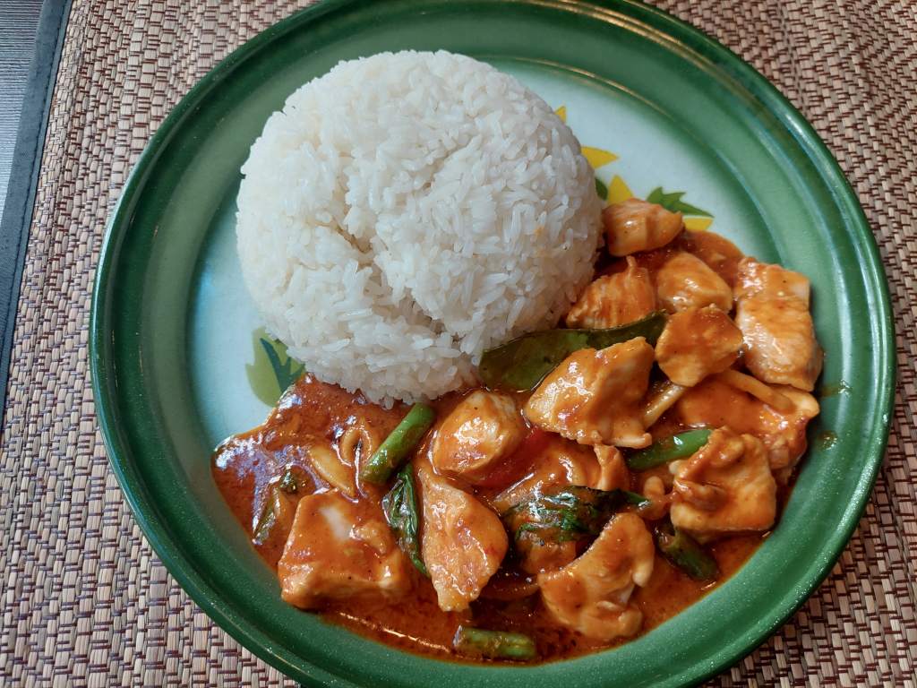 Pad Prik Kang con arroz. Es un salteado tailandés seco, es decir, sin leche de coco, que se elabora salteando una proteína, en este caso pollo, con una pasta de curry rojo, judías verdes y hojas de lima kaffir. Un plato sabroso y bien picante.