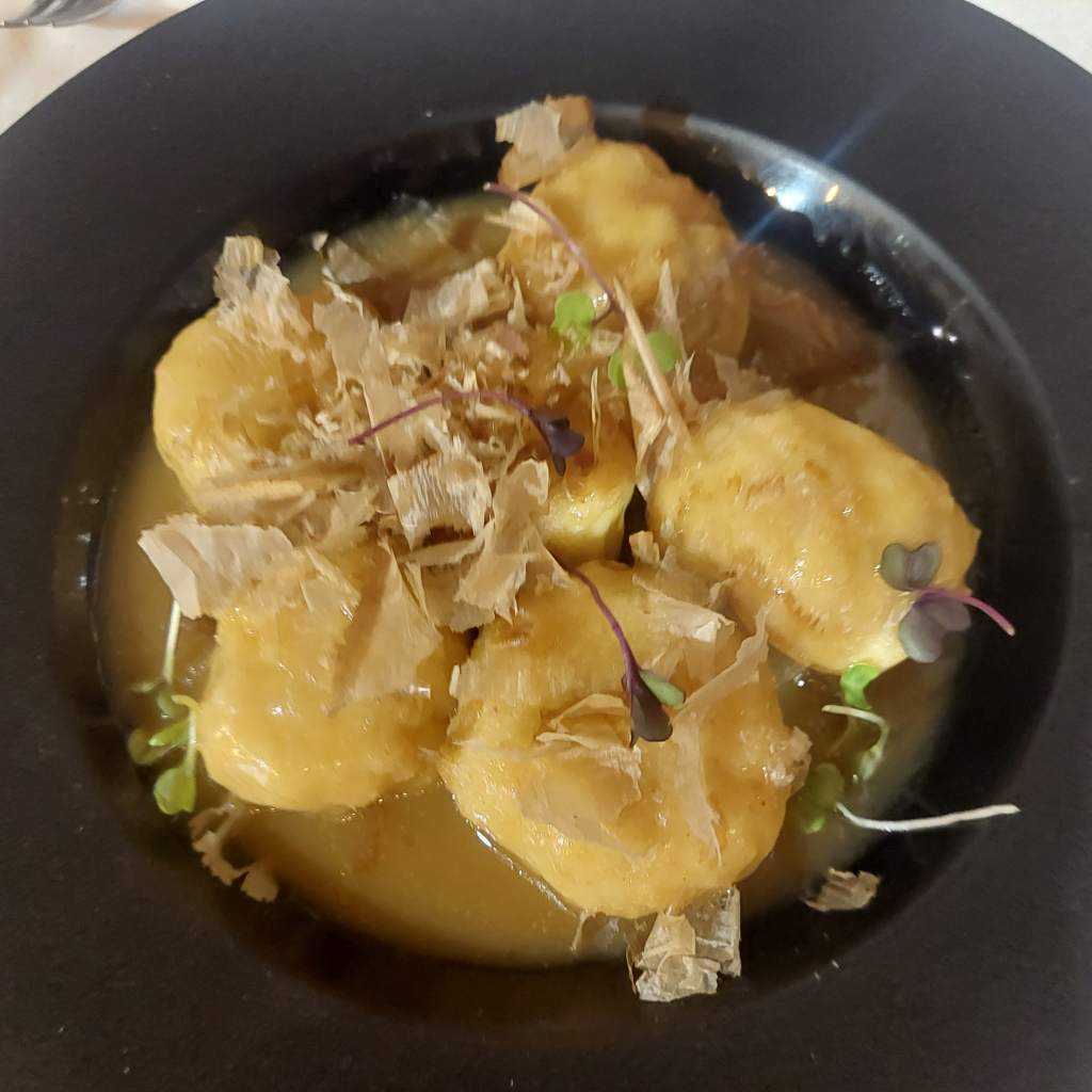 Albóndigas de merluza en salsa de naranja y jengibre con láminas de bonito seco.