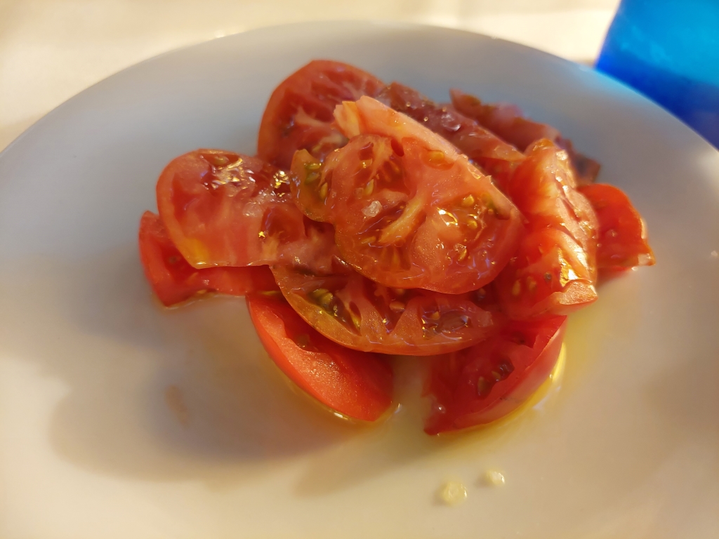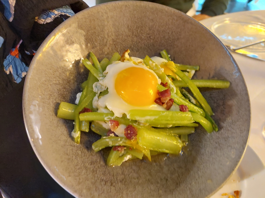 Después de un aperitivo de una estupenda chistorra, tomamos sus emblemáticos platos de verduras: Borrajas con huevo roto y jamón y sus pimientos cristal asados a la parrilla (en recuerdo a la Pili, como dicen en la carta), una maravilla de la huerta navarra por su finura y excelente sabor.