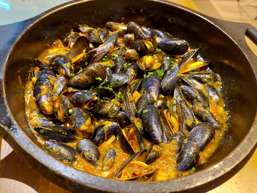 Comenzamos con unos mejillones al curry, con una salsa muy rica pero que desgraciadamente no cumplió expectativas, ya que un buen número de mejillones estaban vacíos. Se lo comentamos a la camarera y nos dijo que sí, que así era. Una respuesta como mínimo un poco singular.