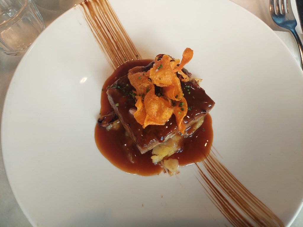 De principales tomamos cordero al horno deshuesado con patatas panaderas, jugoso y en su punto, y la merluza meuniere de 1981, rellena de salmón ahumado y con una salsa donde la mantequilla realza el sabor del pescado y no lo cubre. Muy rico.