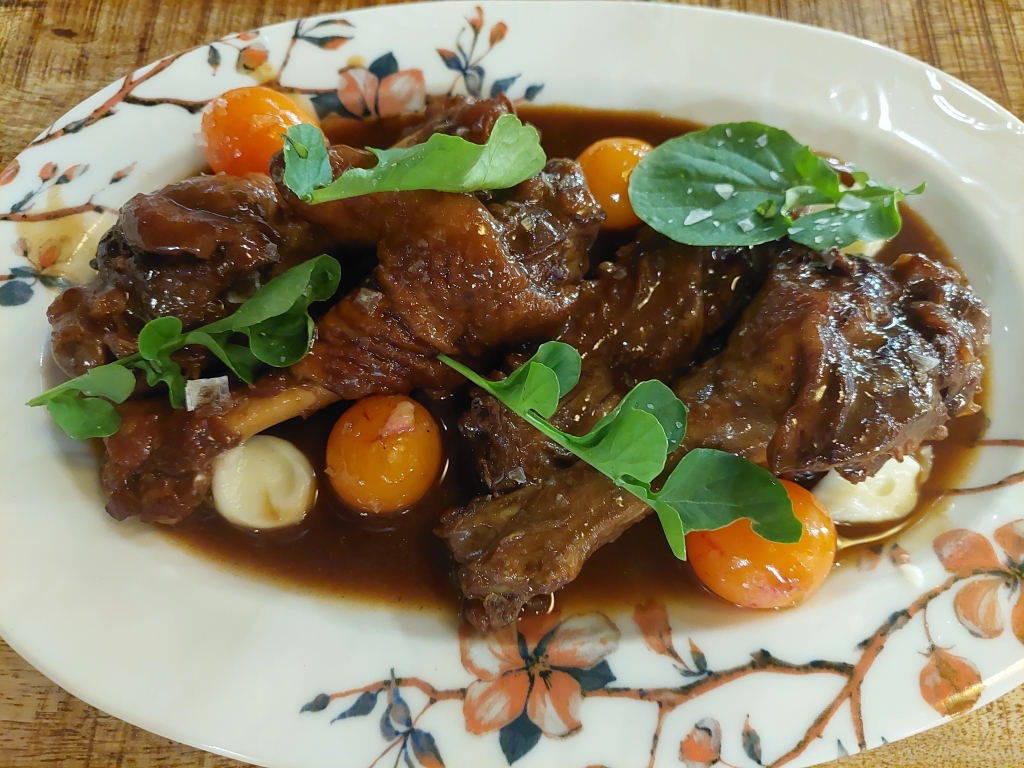 De principales tenían fuera de carta tenía tournedo de cordero, que es como llaman a unos medallones hechos con la carne del cuello del cordero. Resultó un plato muy sabroso. El otro principal fueron alitas y muslos de pato confitado, una enorme ración (sobre todo para cenar), la sorpresa vino con el acompañamiento junto a la salsa, que parecían orejones o algún tipo de fruta, y resultaron ser ¡cuatro yemas de huevo! al ser de un color tan naranja intenso preguntamos a qué se debía, y nos explicaron que eran yemas de huevo embrionario. A mí no me desagradó el sabor tan intenso, pero creo que no le hacía falta al plato, ya de por sí bien. Quizá se deba al afán del restaurante de dar un toque inesperado a sus creaciones. Unos platos tan abundantes conllevan que no quede hueco para el postre.