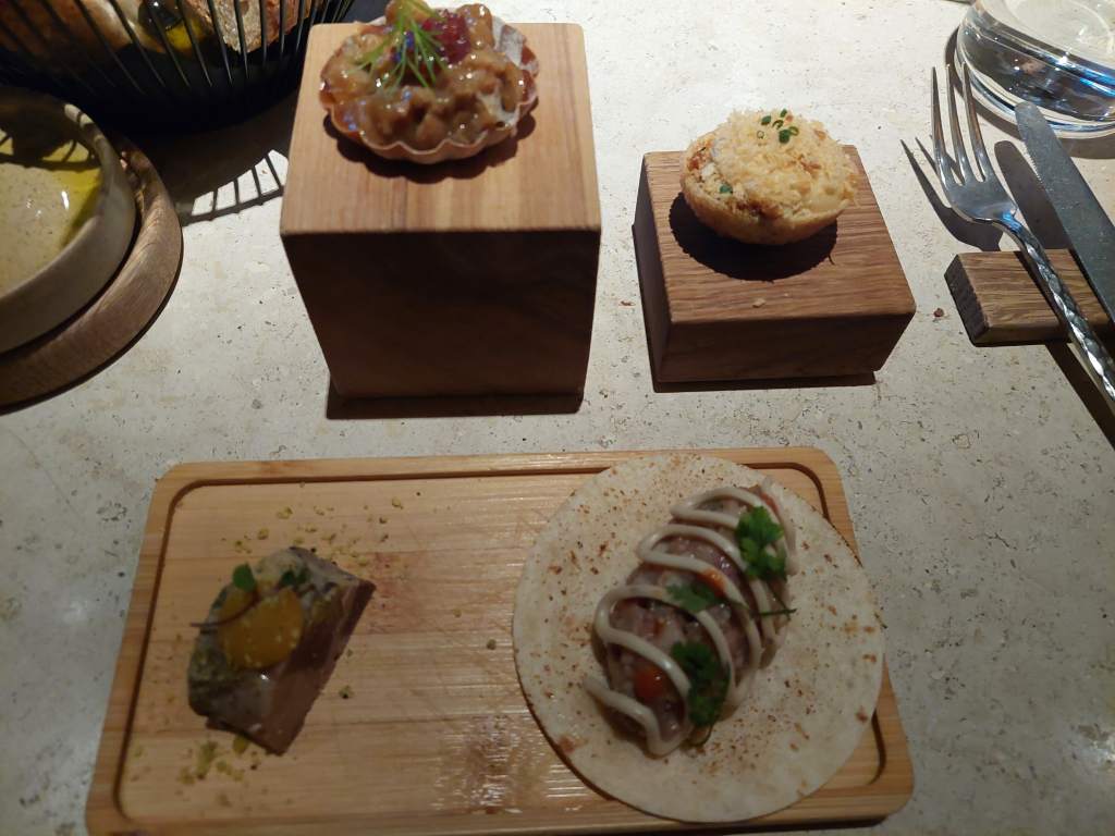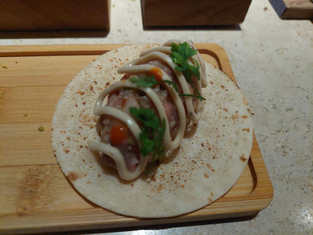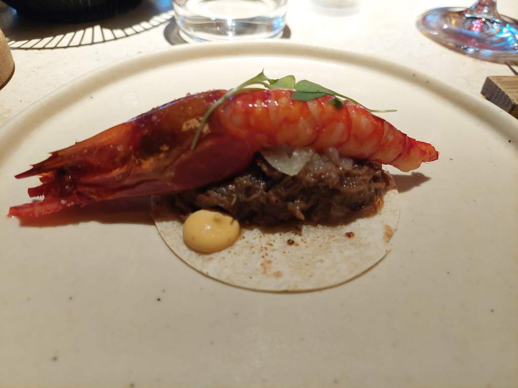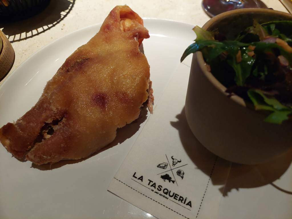 Como extra al menú pedimos uno de sus platos emblemáticos y que no estaba incluido: el taco de carrillera con carabinero, pico de gallo y mahonesa picante. Realmente bueno. Es un plato ya muy copiado en varios restaurantes y ya lo había comido antes. Aún así, la preparación de La Tasquería es sobresaliente.