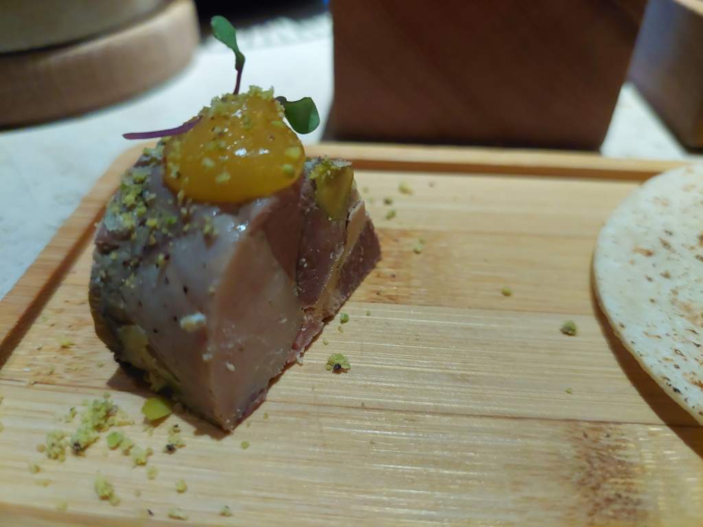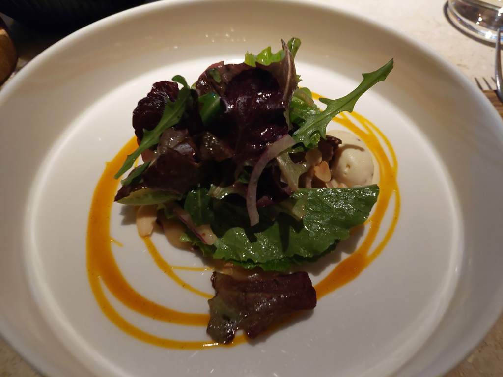 El primer pase es una ensalada de hígado de ternera, con almendras y vinagreta de mostaza.