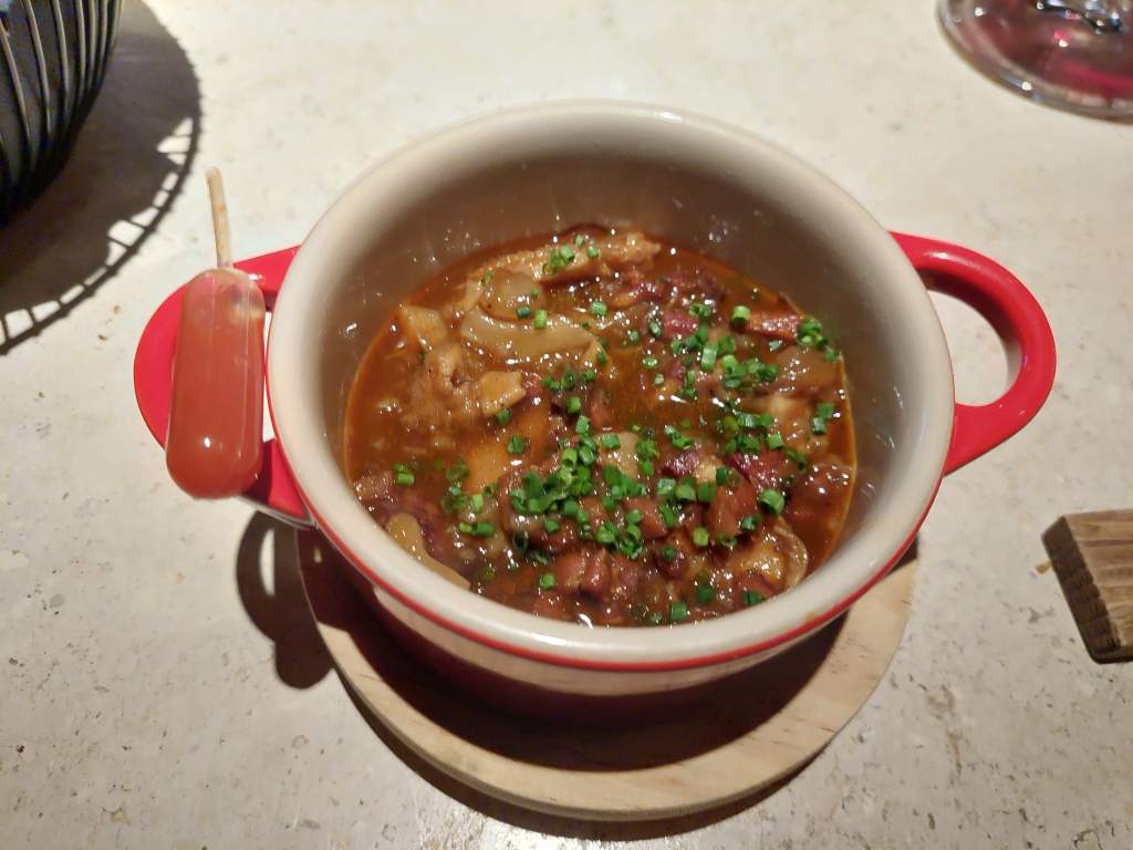 Una cazuelita con Guiso de callos, pata y morro. Lo acompañan de una ampolla de plástico con salsa picante. Este plato me resultó decepcionante en un restaurante de este tipo. Ni siquiera estaban especialmente buenos.