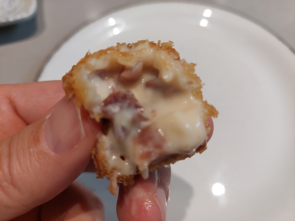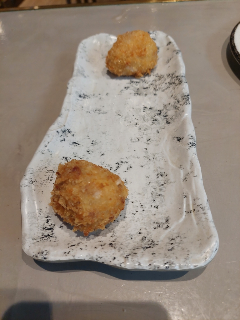 Comenzamos con sus famosas croquetas de jamón, ganadoras de numerosos premios, extremadamente líquidas. Muy ricas.