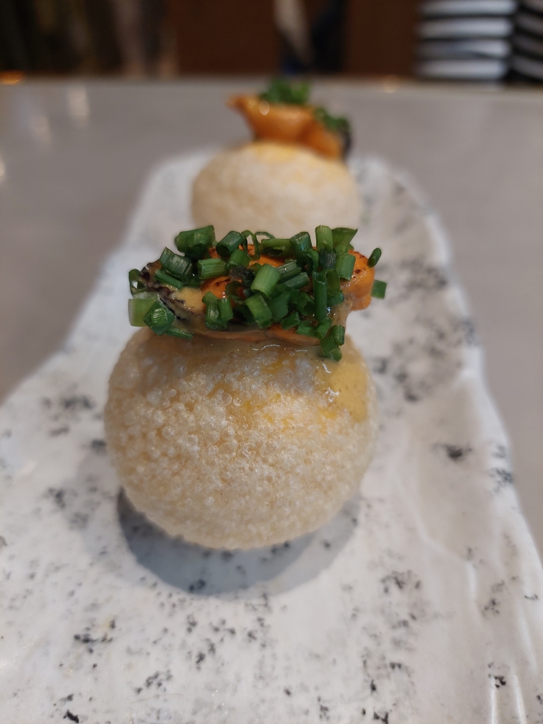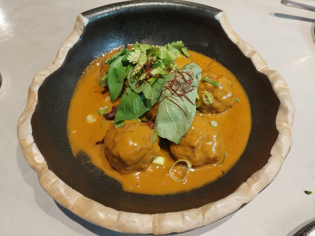 A continuación, bombas de causa limeña y unas albóndigas de vaca vieja con curry (20€ la ración), que fue lo que más me gustó.
