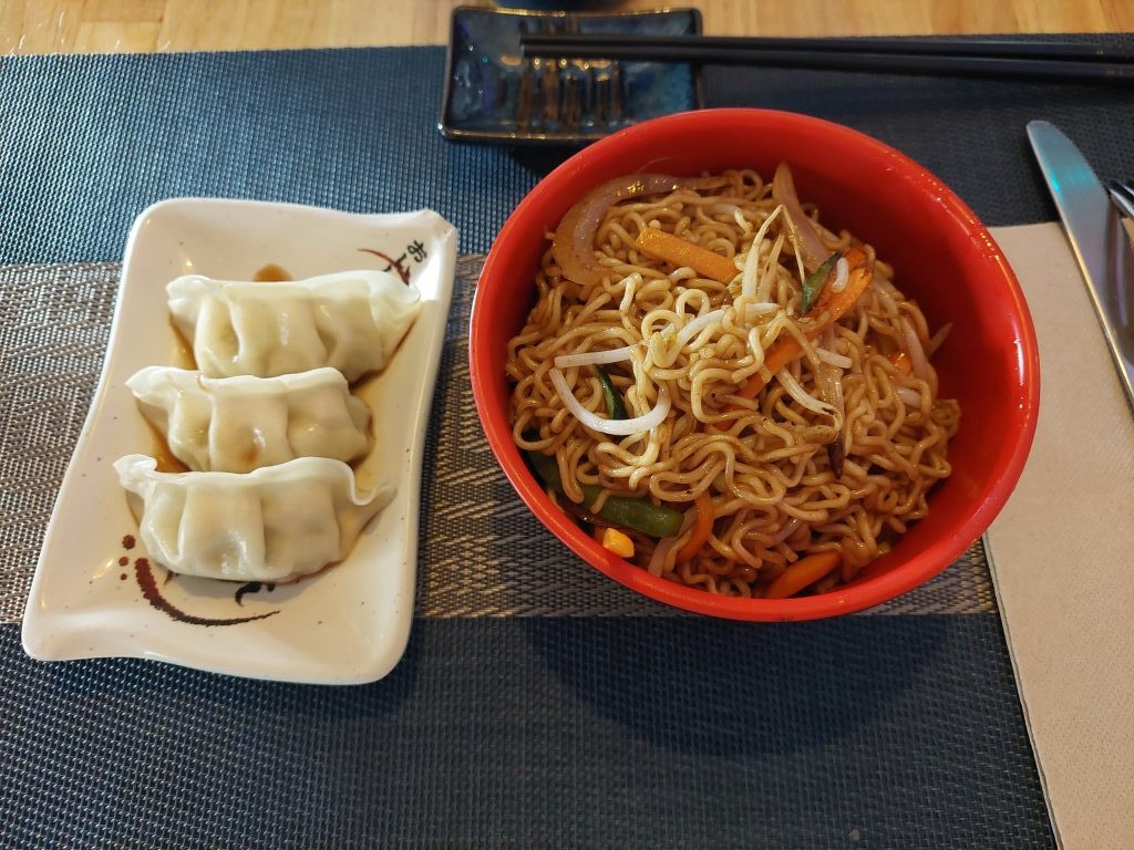 Comenzamos con los entrantes, Gyozas de pollo al vapor y tallarines yakisoba