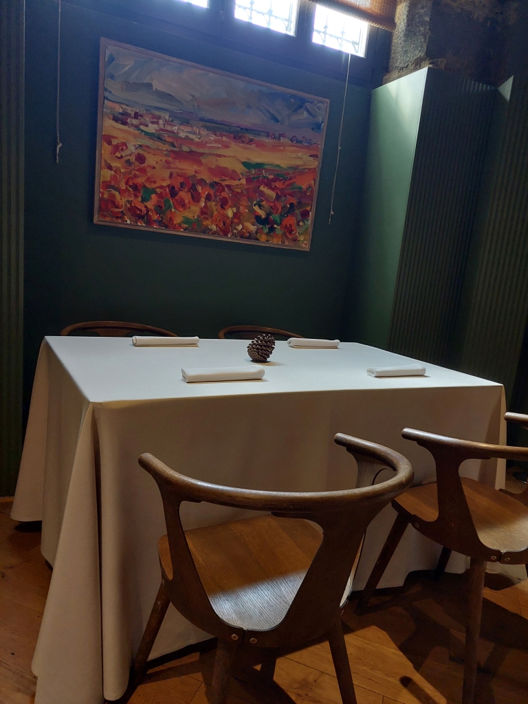 Santerra lleva la cocina manchega que aquí denominan “cocina de monte bajo” a convertirla en una experiencia gourmet. El chef Miguel Carretero está al frente de este restaurante en el barrio de Salamanca y que fue galardonado con una estrella Michelín en 2024. El grupo Santerra cuenta con una zona de barra en local a pie de calle, mientras que el restaurante “a carta” está en la planta baja, en un semisótano. Una sala elegante, como no podía ser de otra manera en un restaurante de esta categoría. Recomiendo las mesas de la parte más interior de la sala, ya que tienen luz natural por unas ventanas altas. Además de este restaurante cuenta con otro en la zona de Ponzano, Neotaberna Santerra, más informal.