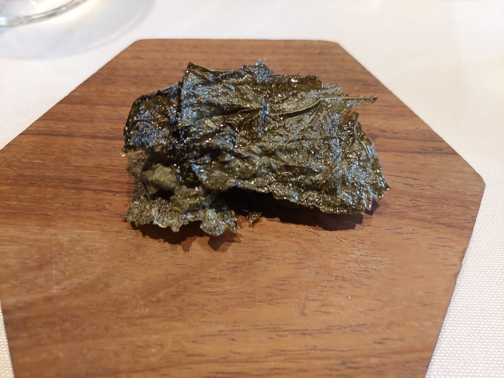 Comienza el menú con cinco aperitivos, para seguir con tres platos principales y dos postres. En primer lugar, un original sándwich de hojas de parra deshidratadas, con una textura crujiente, relleno de paté de aves de media veda con un arrope de vino con anís y alcaravea. Muy sabroso el intenso sabor del paté.