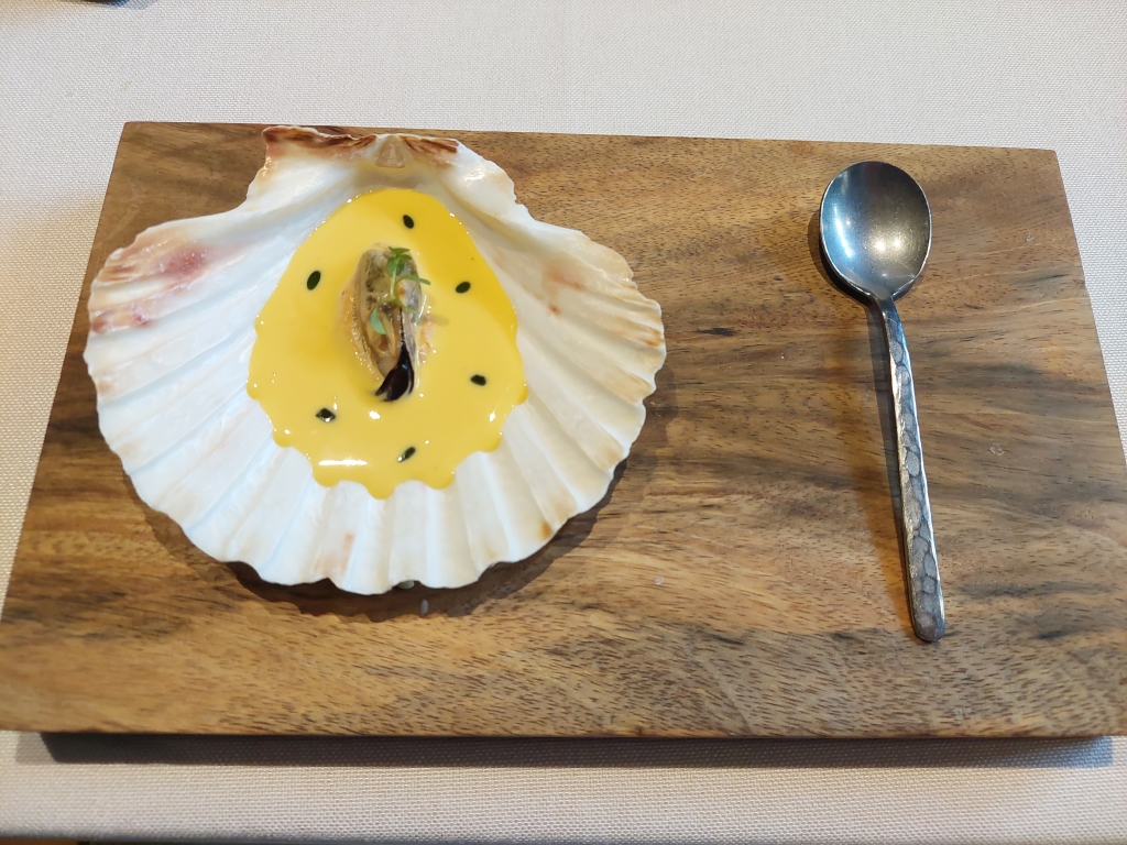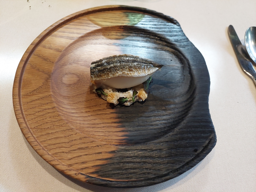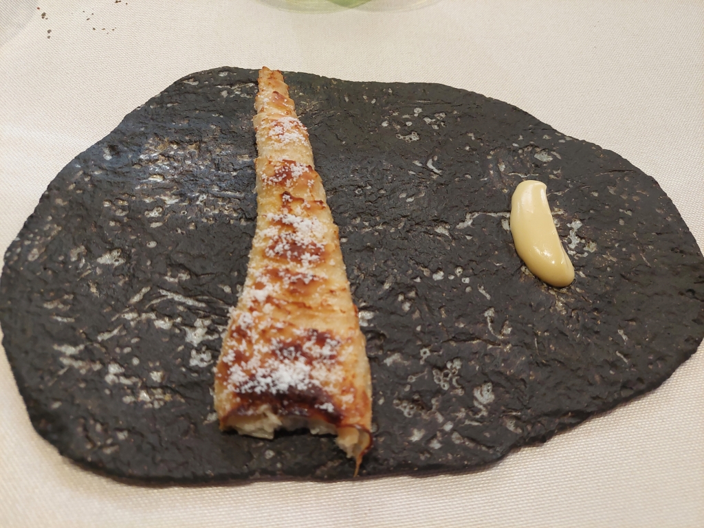 Pasamos al primer plato principal, más bien un entrante. Quizá el plato sobre el que tenía más curiosidad, y que había visto en varias publicaciones: Celerí hojaldrado. El celerí es la traducción al inglés del apionabo. El chef lo lamina muy fino para darle una textura muy similar a un hojaldre. Viene relleno de una purrusalda de anguila ahumada, que le da un sabor muy potente. Para matizar ese sabor hay a la derecha una crema inglesa acidulada, similar a la bearnesa, pero con un toque más ácido. Me gustó mucho. Volvería al restaurante solo para volver a tomar este plato.