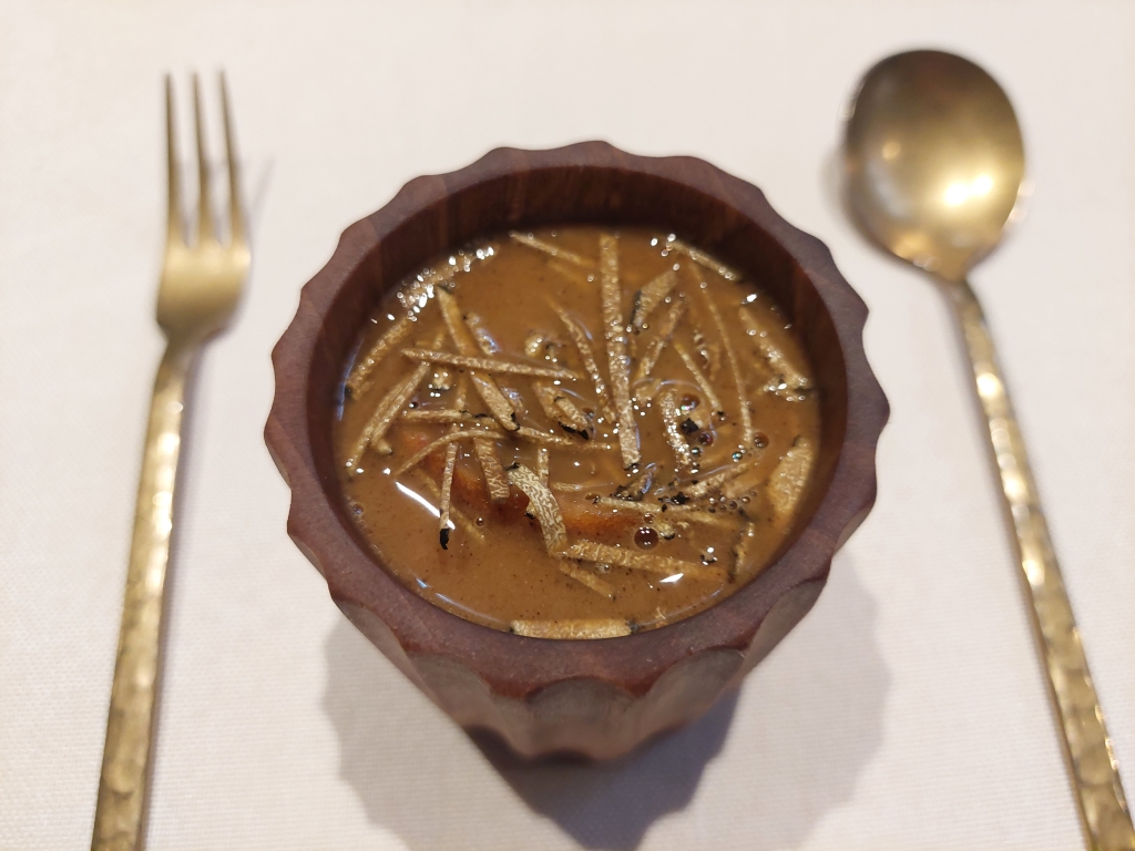Para cerrar el bloque de aperitivos tenemos una sopa de paloma torcaz. El plato, más bien un vaso, viene con un bollito relleno con un salmís de la paloma y sobre él ralladuras de trufa de temporada. El camarero vierte sobre todo ello la sopa de la paloma, que es una sopa muy densa porque, según nos explicaron, cuando se termina de cocinar la sopa trituran las carcasas para obtener su jugo y mezclarlo con brandy de jerez. Me gustó mucho este plato, con un sabor intenso a perdiz.