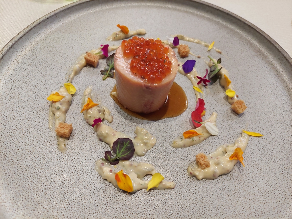 El segundo plato principal fue la Galantina de trucha: el lomo de la trucha relleno de foie de pato y papada ibérica. En la base del plato tenemos una representación de una ensalada con salsa gribiche y un mix de flores y brotes con pitatostes de pan brioche. Este no es un plato para todos los gustos. Es un plato frío, como suelen ser las galantinas, y combinar el sabor de la trucha con el paté de pato resulta extraño al paladar. Fue otro de los pases que menos me gustó.