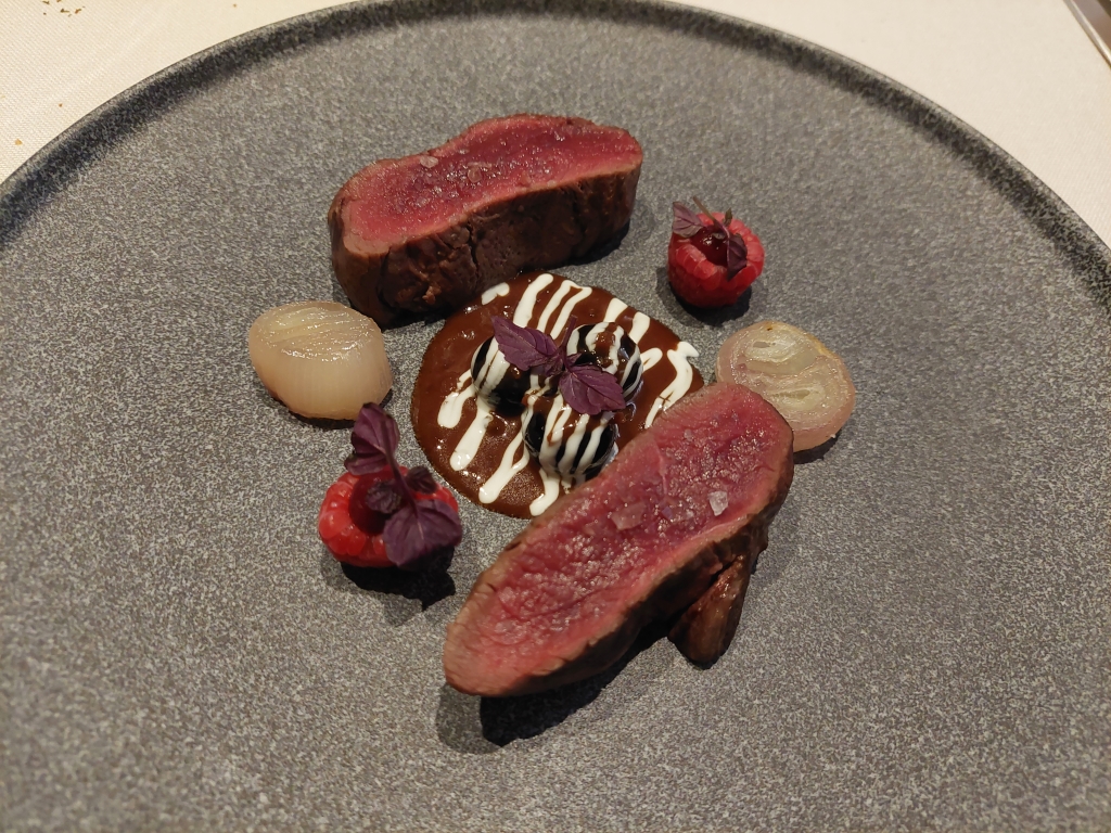 Para terminar, lomo de corzo asado acompañado de arándanos estofados en salsa Grand Veneur y chalotas soasadas. Rico el sabor del corzo y de la salsa. Quizá me pareció que no estaba todo lo caliente que me hubiera gustado. En cualquier caso, un plato sabroso.