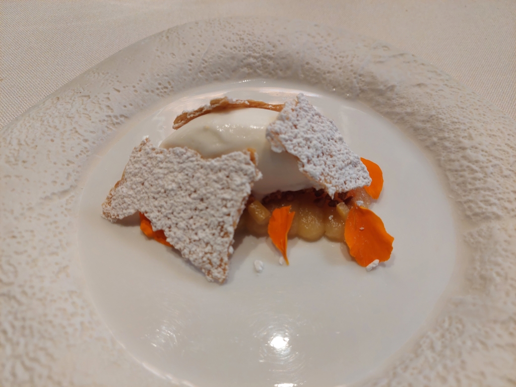 Comenzamos con los dos postres del menú. El primero no sé si definirlo como postre, más bien es un plato introductorio a la parte dulce del menú. Se trata de su versión de la tarta de trucha, un postre que desconocía y que al parecer es originario de León. El postre original leonés consiste en un hojaldre relleno de crema dulde donde agregaban la carne de la trucha. Aquí prescinden del hojaldre y mantienen el relleno dulce con trucha y unos limones fermentados. Para terminar el postre, en la parte superior hay un sorbete de limón y sobre él apoyan un crujiente de pollo terminado en azucar glace. Curiosamente lo que menos me gustó fue el intensísimo sabor a pollo de las láminas crujientes, un sabor que de alguna manera me desagradó con la combinación del sorbete. La crema de trucha y el sorbete en sí, me gustaron.