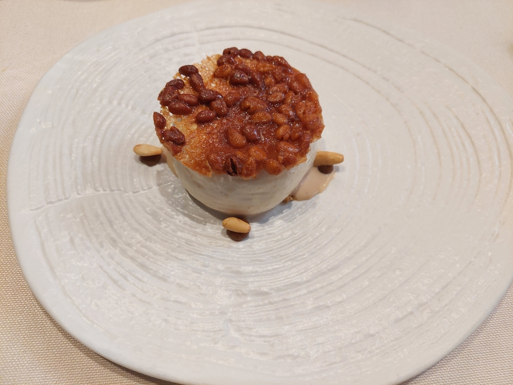 El último pase del menú, el postre propiamente dicho: Pinares de la Serranía Baja, un postre basado en piñones. Homenajea los orígenes pastoriles con la sopa cana con textura de piñones, una sopa de origen navarro que se prepara infusionando leche, nata, naranja, canela y limón, y acompañada de grasa de pato y boletus. Se presenta con helado y crujiente de piñones. Un buen postre para cenar el menú.