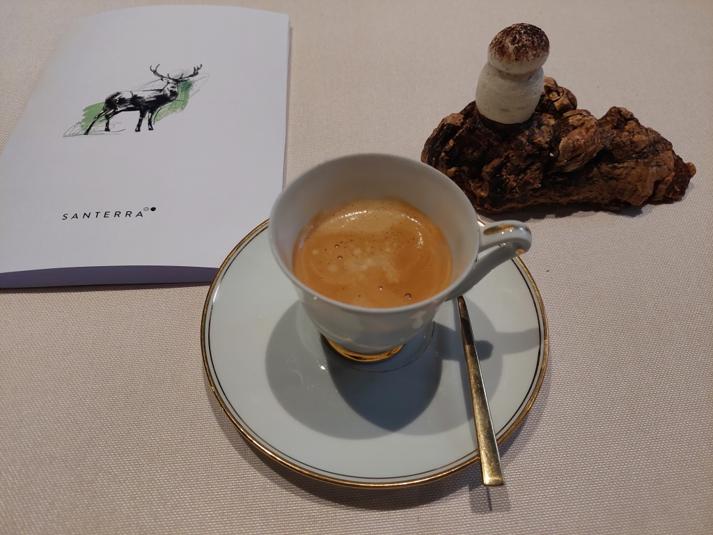El café, acompañado con un petit four con forma de hongo, cómo no.