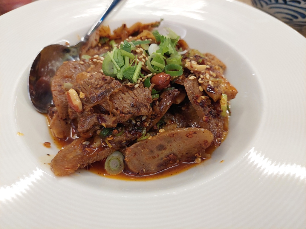 Comenzamos con unos callos, una forma diferente de prepararlos a lo que estamos acostumbrados en España. Vienen como una ensalada fría y picante. Incluye también lengua .