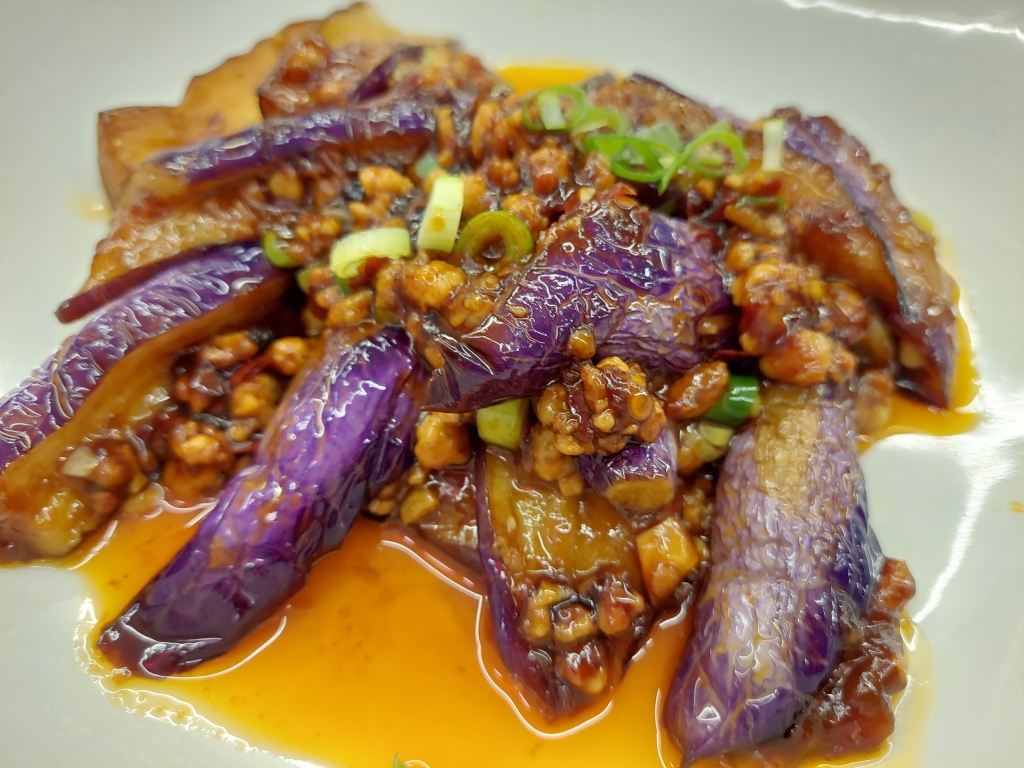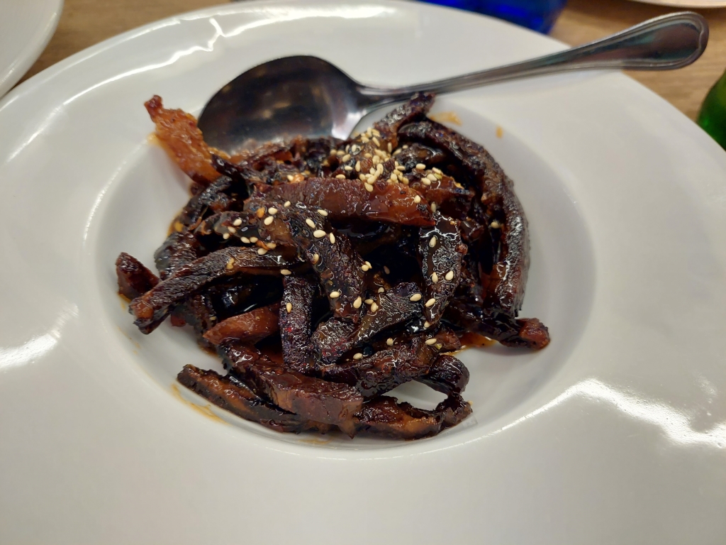 Berenjenas con toques de ajo y picante. Otro de los indispensables de la casa.