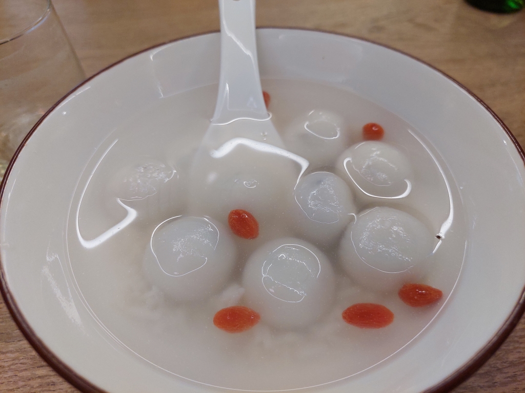 Llegamos a los postres, que como suele ser habitual en los restaurantes asiáticos, son bastante prescindibles. En esta ocasión pedimos las bolas de arroz glutinoso con sésamo en su interior en un caldo templado. Con una textura gomosa, no me han gustado.