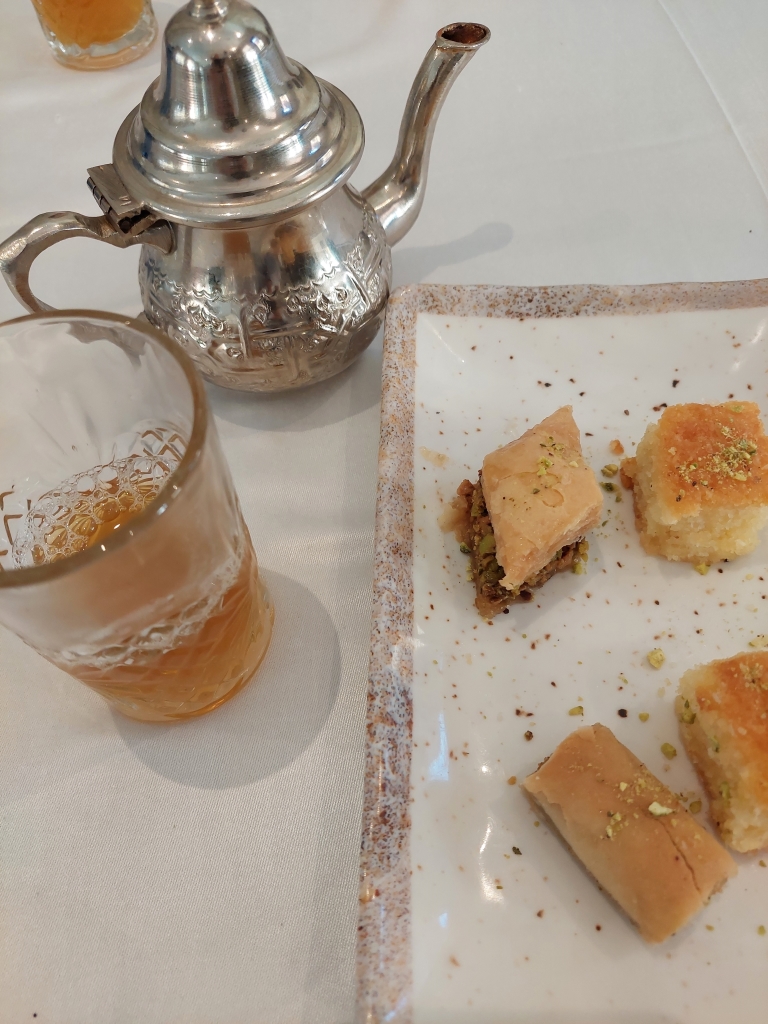 Restaurante libanés con menú del día (14€). Garbanzos con crema de humus y shawarma de ternera (tiras de carne marinada), y otro menú con calabacín y mousaka. Sin estar mal, ha sido flojo. Recuerdo haber cenado aquí hace años mucho mejor.