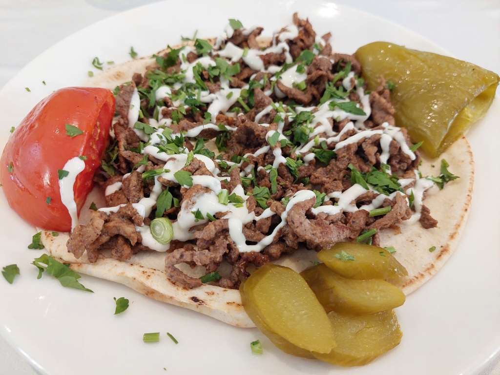 De principal, Shawarma, tiras de ternera marinadas y salteadas cubiertas de salsa tahine con guarnición de verduras.
