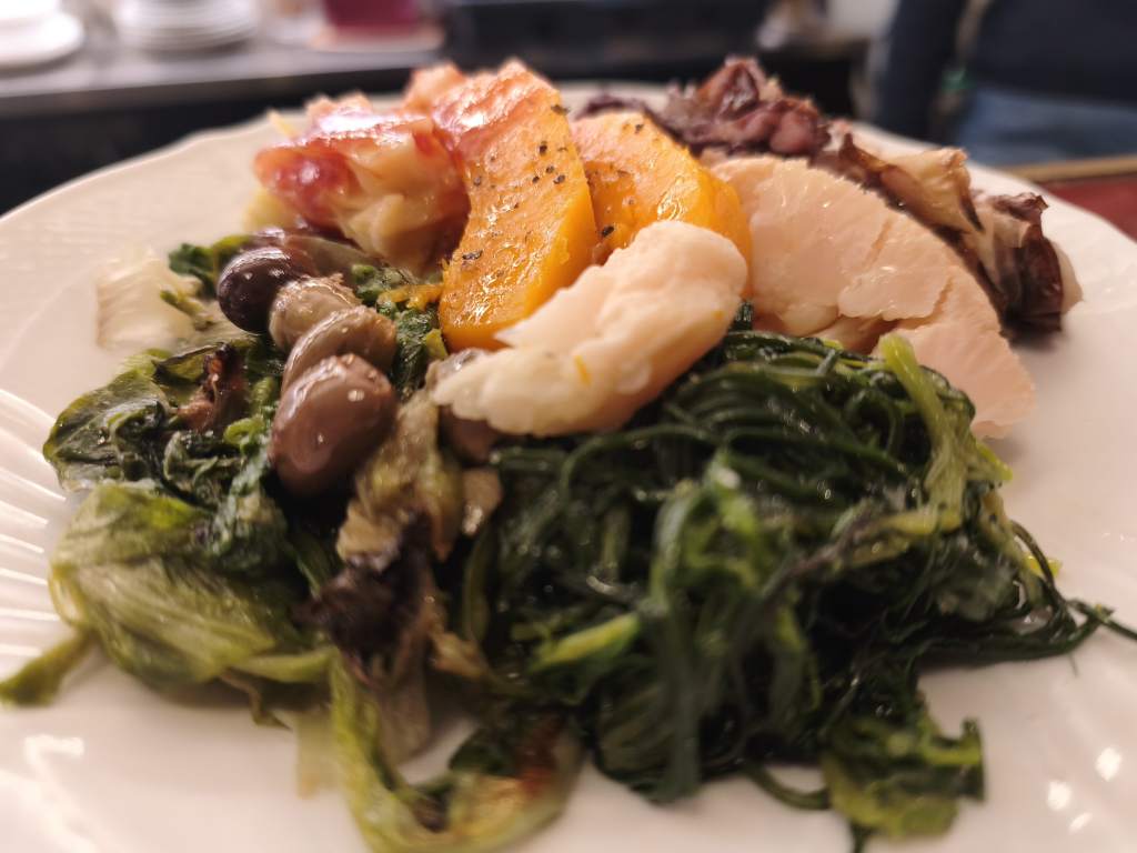 Comenzamos con unas verduras mixtas: calabaza asada, coliflor, lombarda, acelgas… una combinación fresca destacando el sabor de cada verdura. Nos gustó mucho.