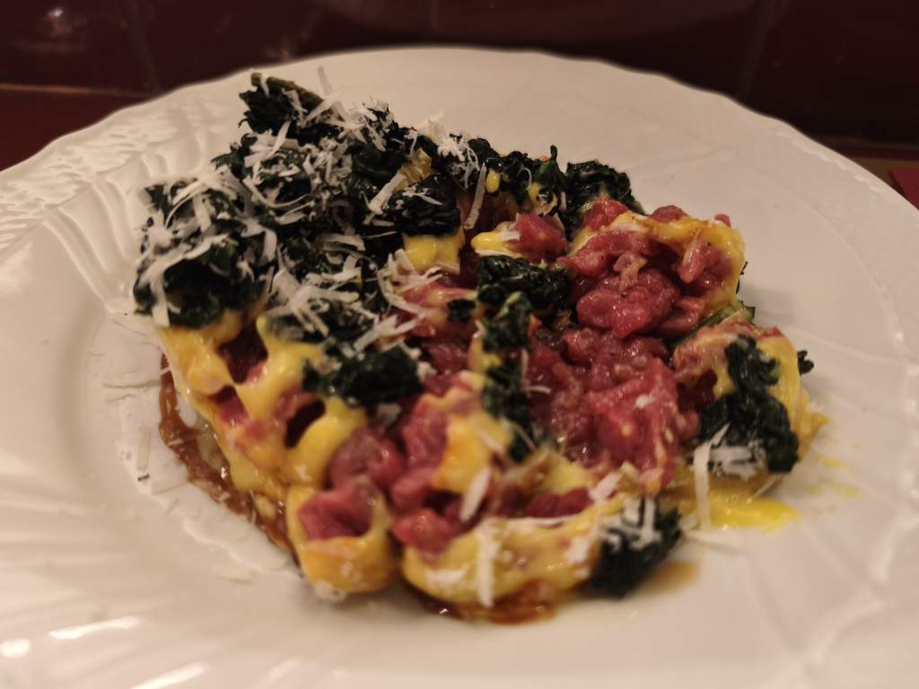 El otro plato fue un steak tartar de fassona con col rizada rustida y salsa de huevo. La fassona es una raza bovina autóctona de la región de Piamonte reconocida por producir carne magra, tierna y sabrosa. Realmente fue tal como se describe. Habitualmente no soy amigo de aditivos al steak tartar pero la salsa de huevo le proporcionaba un sabor adicional a la carne que me pareció muy adecuado.