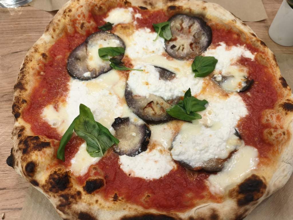 La pizzería es pequeña, con un par de mesas junto a la entrada, y un comedor más amplio en la planta baja. Muy buena masa y bien de precio. No se puede pedir mucho más. En esta visita pedimos la pizza Norma (14,5€), que, aparte de la habitual base de salsa de tomate y mozarella, lleva berenjena y ricotta. Lástima que no quedaban arancini cuando llegamos.