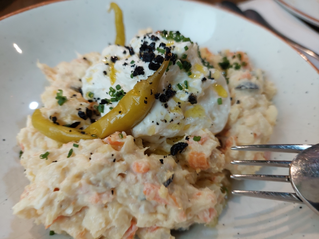 Comenzamos con su ensaladilla rusa con espuma de mayonesa de piparras. Un estupendo inicio.